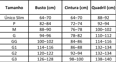 Nossas medidas são feitas fora do corpo e sem esticar o tecido, podendo haver pequenas variações de acordo com o modelo e o tecido.